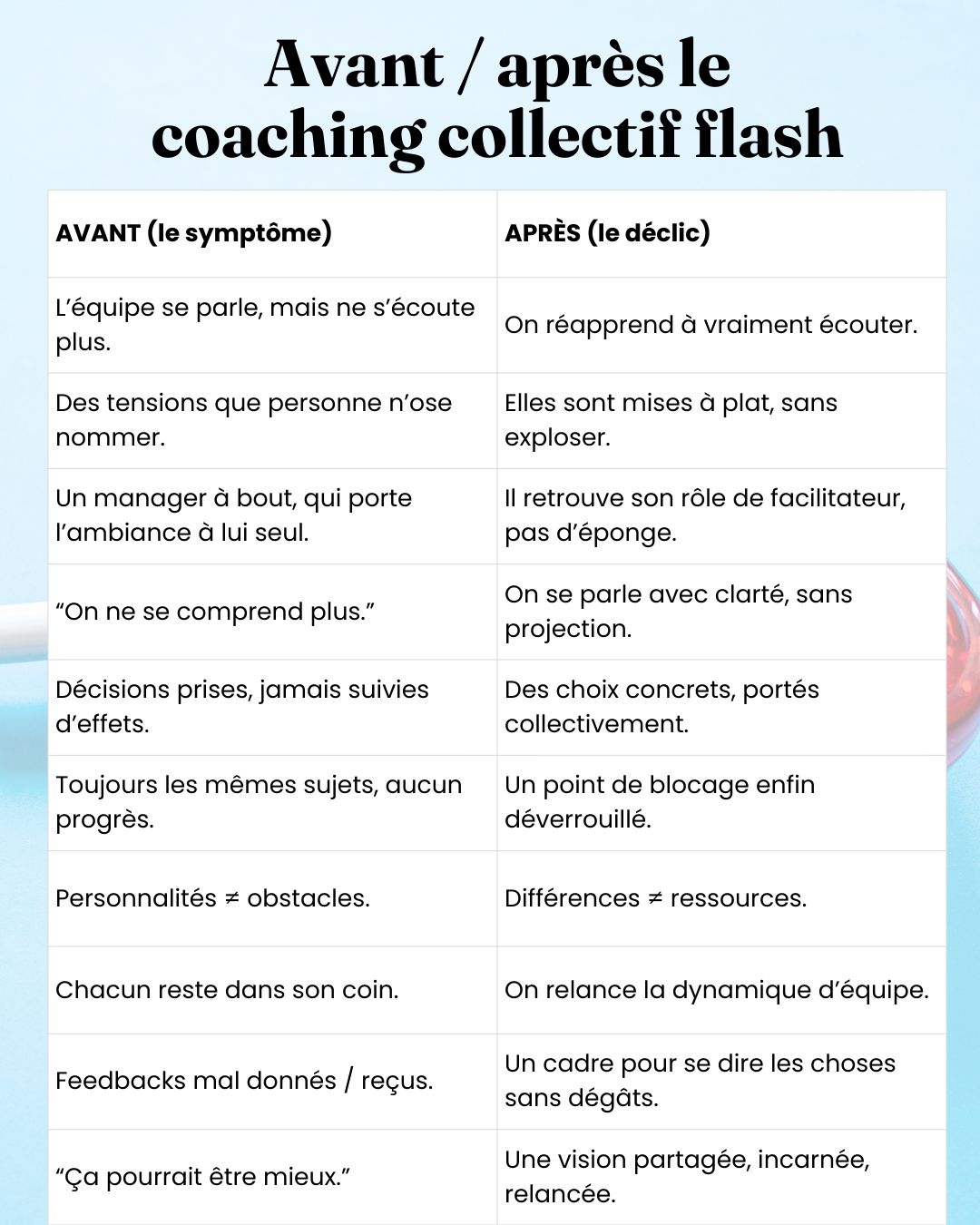 ๐—'๐—ฎ๐—ถ ๐˜‚๐—ป ๐˜๐—ฟ๐˜‚๐—ฐ ๐—พ๐˜‚๐—ถ ๐—บ๐—ฎ๐—ฟ๐—ฐ๐—ต๐—ฒ ๐—ฑ๐—ฒ ๐—ณ๐—ผ๐˜‚. Je l'appelle ๐—น๐—ฎ ๐—ฆ๐˜‚๐—น๐—ณ๐—ฎ๐˜๐—ฒ๐˜‚๐˜€๐—ฒ ๐—ฑ๐—ฒ ๐˜๐—ฒ๐—ป๐˜€๐—ถ๐—ผ๐—ป๐˜€ ๐—ฑ'๐—ฒฬ๐—พ๐˜‚๐—ถ๐—ฝ๐—ฒ. ๐Ÿฏ๐—ต. Un avant/aprรจs encore plus visible que celui du masque au collagรจne. Prends ton cafรฉ, je t'explique. ๐—”๐—ฉ๐—”๐—ก๐—ง : Ton รฉquipe fonctionne "bien". ร‡a se passe plutรดt correctement. Mais tu sens que รงa coince quelque part. Les non-dits s'accumulent. Les incomprรฉhensions plombent l'ambiance. Les petits couacs deviennent des gros hics. Tu te dis : "ร‡a pourrait รชtre mieux." ๐—ง๐˜‚ ๐—ฎ๐˜€ ๐—ฟ๐—ฎ๐—ถ๐˜€๐—ผ๐—ป. ๐—–๐—ข๐— ๐— ๐—˜๐—ก๐—ง ร‡๐—” ๐— ๐—”๐—ฅ๐—–๐—›๐—˜ ? ๐Ÿญ/ ๐—ง๐˜‚ ๐—บ'๐—ฎ๐—ฝ๐—ฝ๐—ฒ๐—น๐—น๐—ฒ๐˜€. On parle de lร  oรน รงa coince. Je comprends ton รฉcosystรจme. Je me nourris de tes exemples. ๐Ÿฎ/ ๐—๐—ฒ ๐—ฐ๐—ผ๐—ป๐˜€๐˜๐—ฟ๐˜‚๐—ถ๐˜€ ๐˜‚๐—ป ๐—ฝ๐—ฟ๐—ผ๐—ด๐—ฟ๐—ฎ๐—บ๐—บ๐—ฒ ๐˜€๐˜‚๐—ฟ-๐—บ๐—ฒ๐˜€๐˜‚๐—ฟ๐—ฒ. Pas de PowerPoint gรฉnรฉrique. Du concret. Adaptรฉ ร  TA situation. ๐Ÿฏ/ ๐—Ÿ๐—ฒ ๐—ท๐—ผ๐˜‚๐—ฟ ๐— : ๐˜€๐—ฒ๐˜€๐˜€๐—ถ๐—ผ๐—ป ๐—ฑ๐—ฒ ๐Ÿฏ๐—ต๐Ÿฏ๐Ÿฌ. J'installe un cadre de confiance et de sรฉcuritรฉ. Et on passe la matinรฉe ร  manipuler ce concept simple mais puissant : "๐—Ÿ๐—ฎ ๐˜ƒ๐—ฒฬ๐—ฟ๐—ถ๐˜๐—ฒฬ ๐—ป'๐—ฒ๐˜€๐˜ ๐—พ๐˜‚๐—ฒ ๐—ฆ๐—” ๐˜ƒ๐—ฒฬ๐—ฟ๐—ถ๐˜๐—ฒฬ." ๐—Ÿ'๐—ข๐—•๐—๐—˜๐—–๐—ง๐—œ๐—™ ? Cultiver la curiositรฉ dans ton รฉquipe. Arrรชter les : โ†’ "C'est comme รงa, pas autrement" โ†’ "C'est รฉvident" โ†’ "De toute faรงon, tu comprends jamais" Et remettre de la nuance. De l'รฉcoute. De la comprรฉhension. โ€”> ๐—”๐—ฃ๐—ฅรˆ๐—ฆ : Ton รฉquipe a partagรฉ un chouette moment. ๐—˜๐˜ ๐—ฆ๐—จ๐—ฅ๐—ง๐—ข๐—จ๐—ง : Elle se reparle. Elle se comprend mieux. Les collaborateurs prennent moins les choses personnellement. Ils repartent avec un ๐—ฝ๐—น๐—ฎ๐—ป ๐—ฑ'๐—ฎ๐—ฐ๐˜๐—ถ๐—ผ๐—ป ๐—ถ๐—ป๐—ฑ๐—ถ๐˜ƒ๐—ถ๐—ฑ๐˜‚๐—ฒ๐—น et un ๐—ฒ๐—ป๐—ด๐—ฎ๐—ด๐—ฒ๐—บ๐—ฒ๐—ป๐˜ ๐—ฐ๐—ผ๐—น๐—น๐—ฒ๐—ฐ๐˜๐—ถ๐—ณ. โ€”> ๐—–'๐—˜๐—ฆ๐—ง ๐—ฃ๐—ข๐—จ๐—ฅ ๐—ค๐—จ๐—œ ? โœ“ Les รฉquipes qui fonctionnent "bien" mais sentent qu'il y a des tensions sous le tapis โœ“ Les managers qui en ont marre de gรฉrer les non-dits en coulisses โœ“ Les RH qui veulent investir dans la cohรฉsion (vraiment) โ€”> ๐—Ÿ๐—˜๐—ฆ ๐—ฅร‰๐—ฆ๐—จ๐—Ÿ๐—ง๐—”๐—ง๐—ฆ ? โ€ข Des รฉquipes qui se reparlent (pour de vrai) โ€ข Des managers qui me disent : "On aurait dรป le faire plus tรดt" Et toi, cโ€™est quoi ton avant / aprรจs rรชvรฉ ?